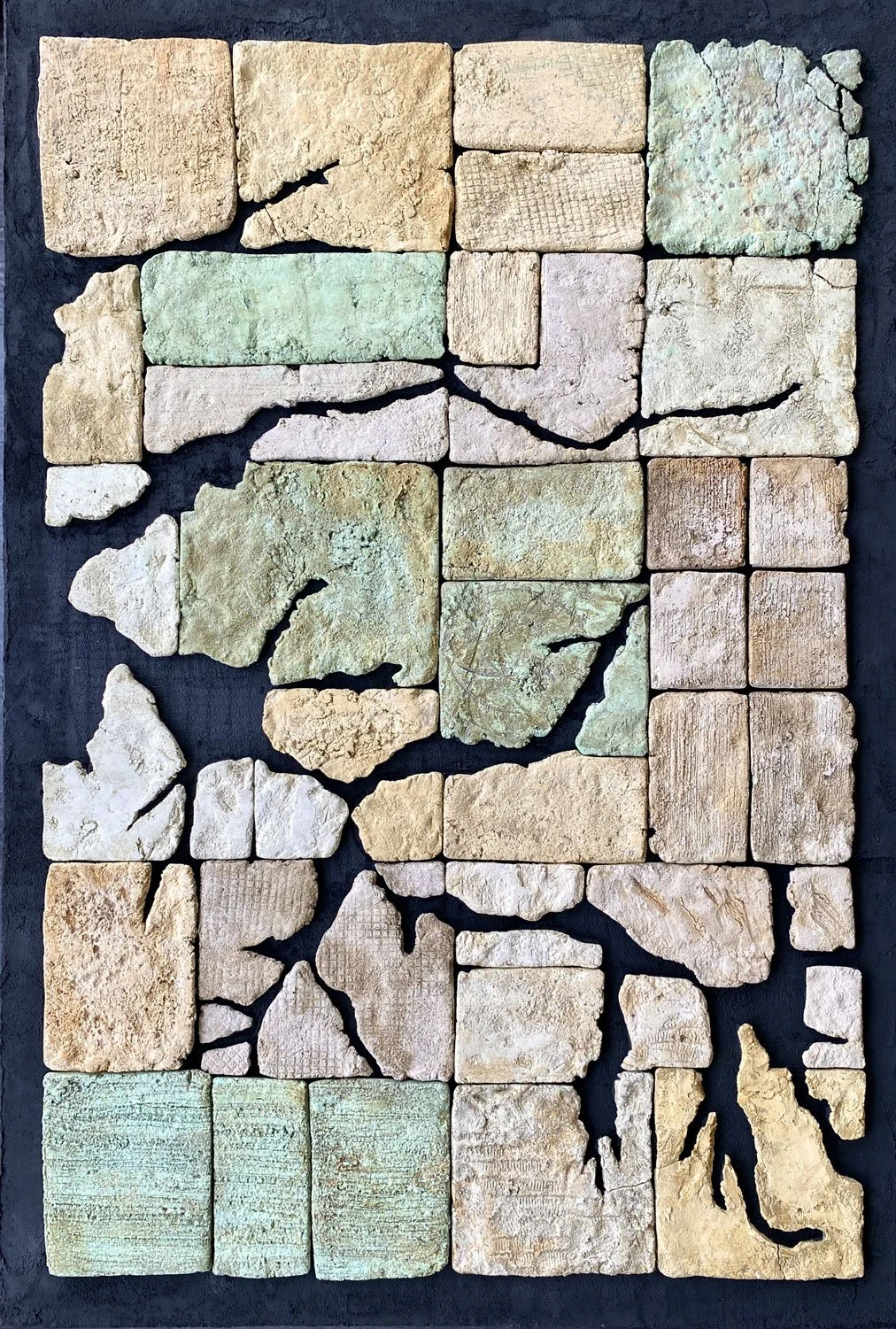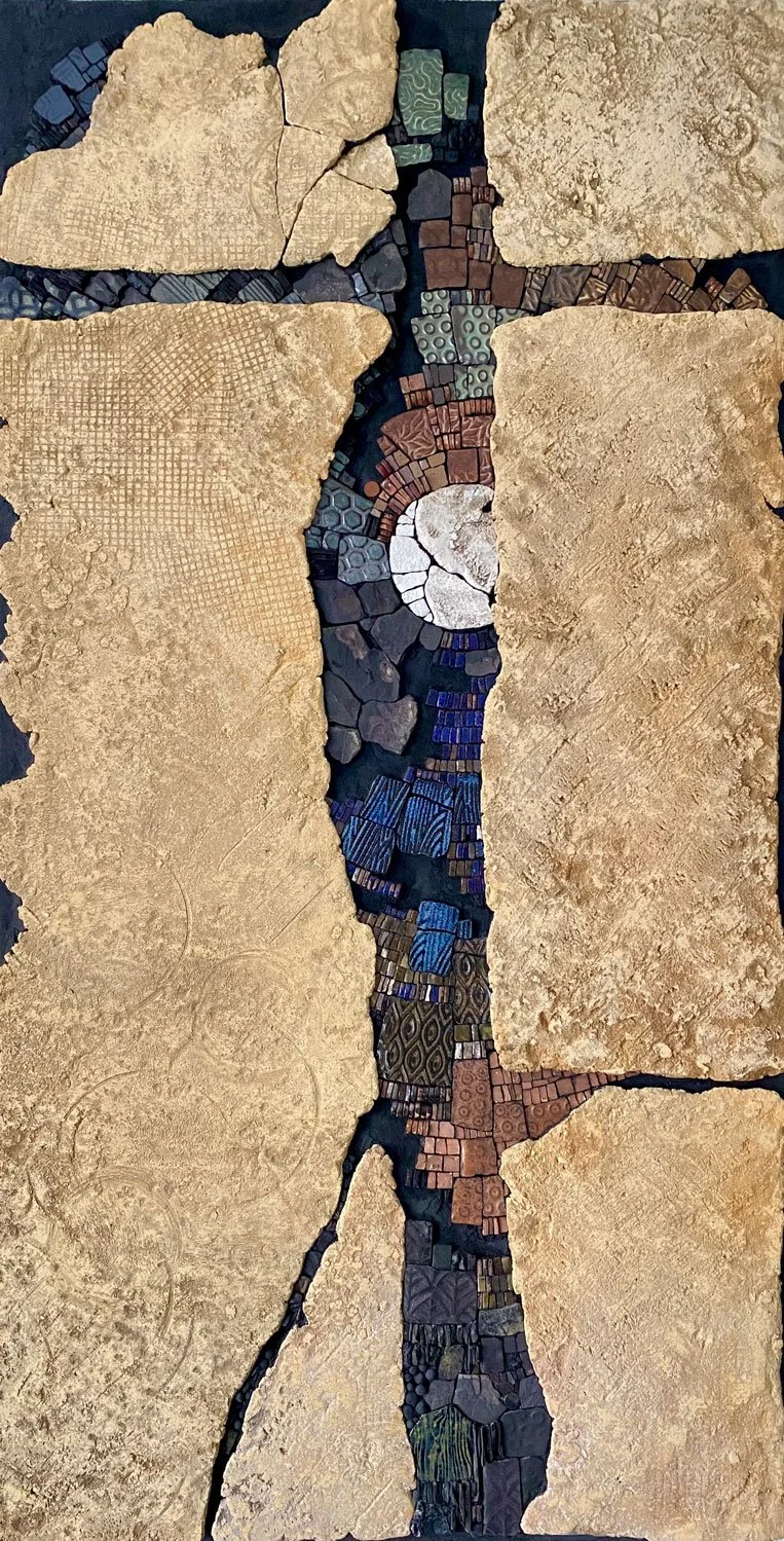 Each mosaic tells a story for me, one that develops as it goes along. I create metaphors for life as I work through my process and see what fits together and what doesn’t, what moves the story forward and what causes a shift in my thinking. I am fascinated by the unexpected change that just one piece of stone can create. When I am finished, though, my story ends and yours begins. It is no longer important why I chose a particular color or placed one stone next to another. What is important now is the connection that you can make with your own experiences and the personal stories that emerge from that connection.